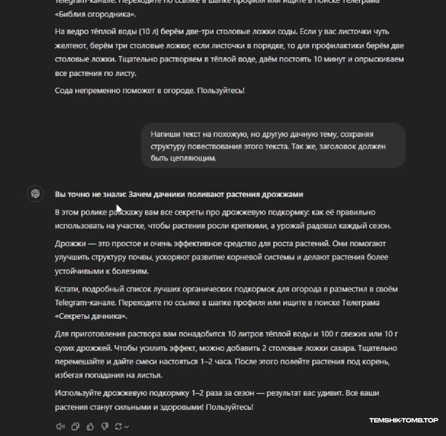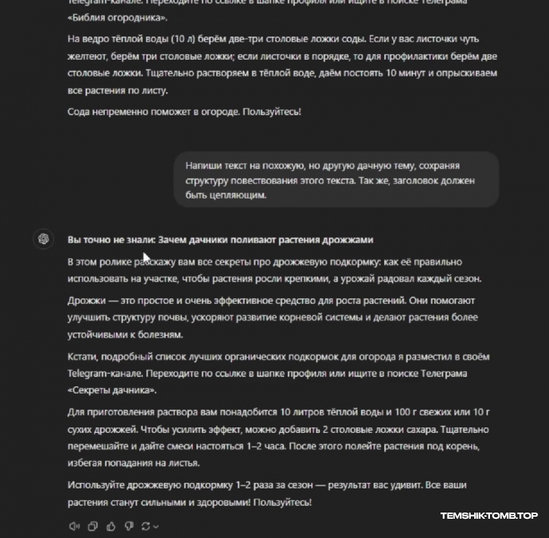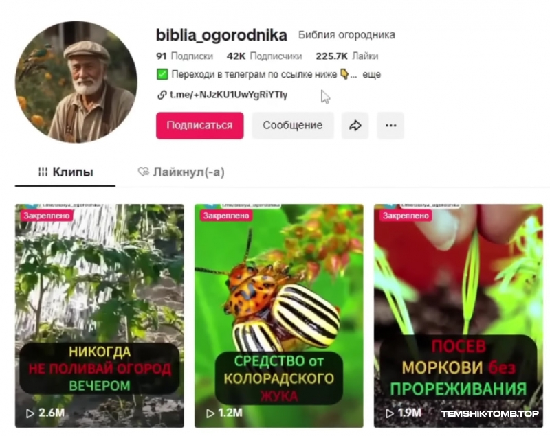 Итак, наш креатив готов. Нам нужно загрузить его на все возможные платформы: TikTok, Instagram, YouTube, ВКклипы, Яндекс Дзен, чтобы затронуть максимальное количество аудитории. Ваша задача - регулярно загружать такие видео каждый день, от одного до трёх креативов, анализировать, какие ролики заходят аудитории, а какие собирают плохие просмотры, и переливать пользователей в свой Telegram, где мы и будем монетизировать свои труды. Дачная тематика не слишком популярная осенью и зимой, зато сейчас, летом, и тем более весной, дает пушечный актив.