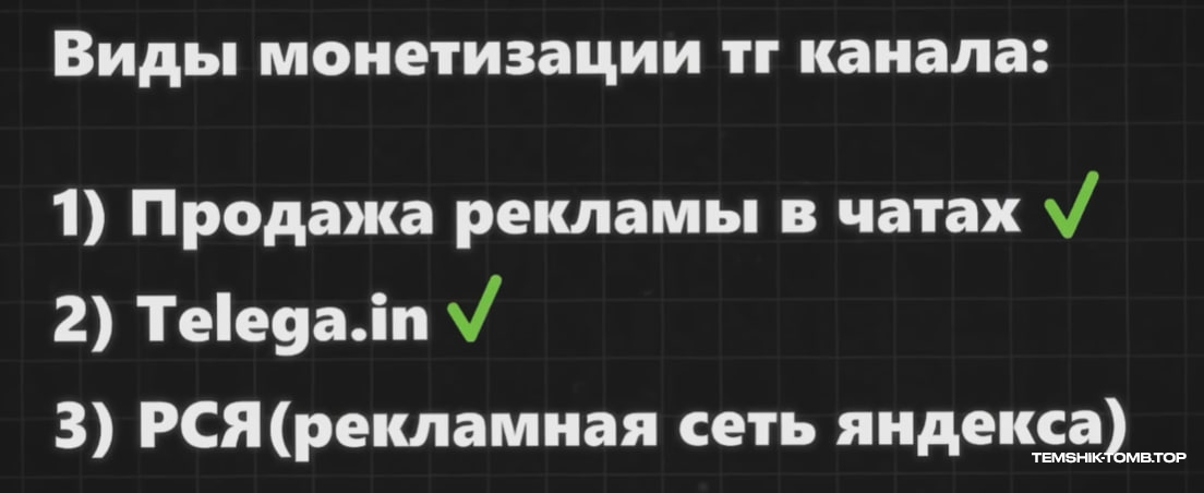 Как я уже говорил в модулях, у нас есть три способа продавать рекламу в своём канале. Телега ИН, рекламная сеть Яндекса и админские чаты. Советую использовать телегу и админские чаты, а Яндекс подключать по ситуации.