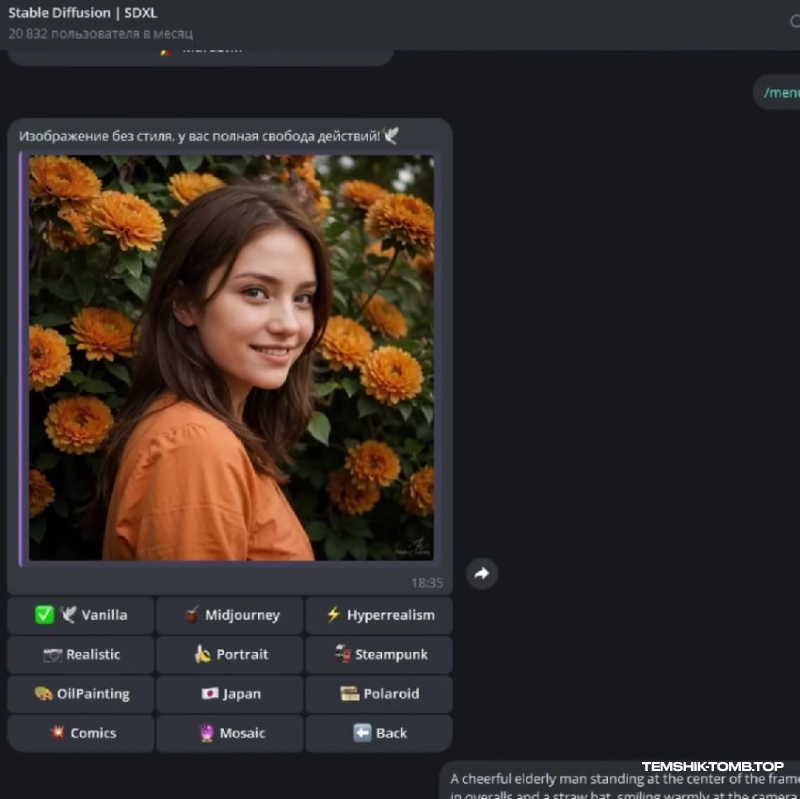 Вы можете использовать такой промт или придумать свой. Он написал нам 10 вариантов. Переходим в Telegram бота Stable Diffusion, в формате выбираем 9х16, в модели кликаем на Realvis XL, а в стиле на ванила. Так нам будет генерироваться максимально реалистичные изображения.