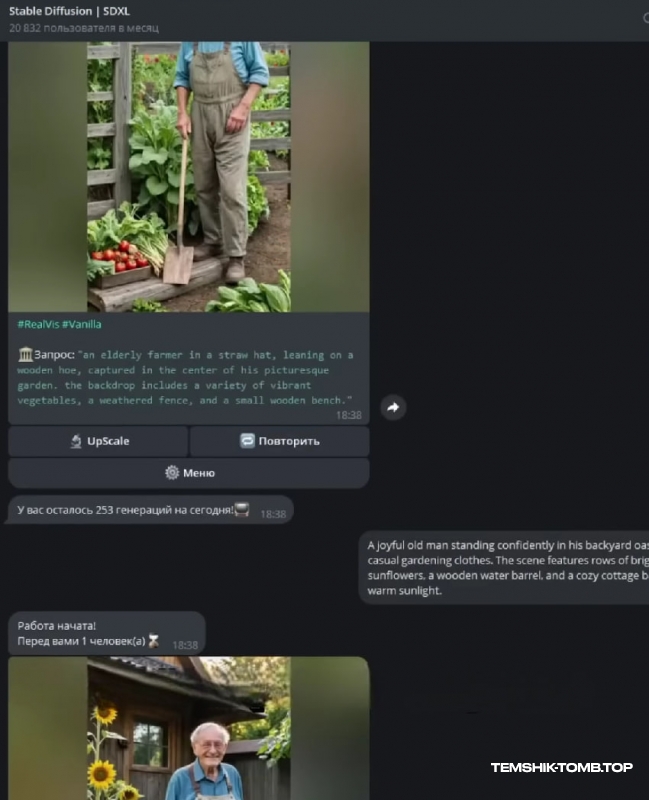 Мне не понравилось, что они слишком отдалены от кадра, поэтому я попросил GPT написать в промтах, чтобы они находились поближе. Этот дедушка с тыквой мне нравится. Нажимаю на кнопку Upscale, чтобы добиться максимальной детализации. И посмотрите, что у нас получилось.