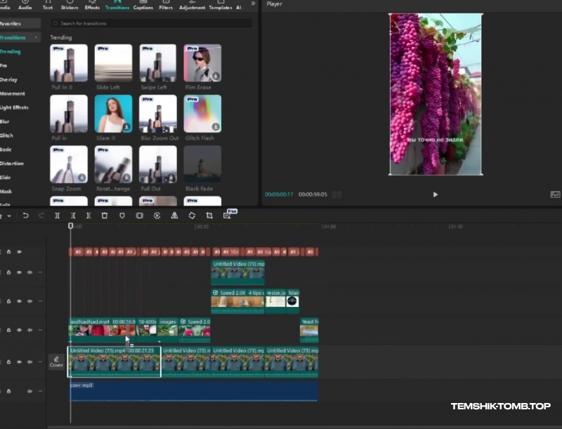 Когда все материалы найдены, начинаем раскидывать их по таймлайну. Добавляю между сменами кадров анимации или переходы. Старайтесь монтировать ваши ролики так, чтобы каждые 3 - 5 секунд картинка менялась. Нельзя давать зрителю заскучать.