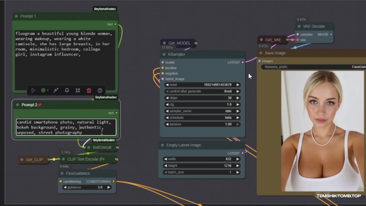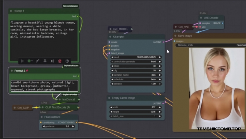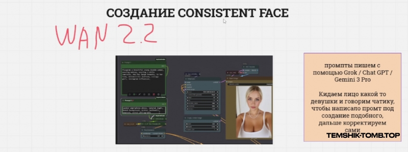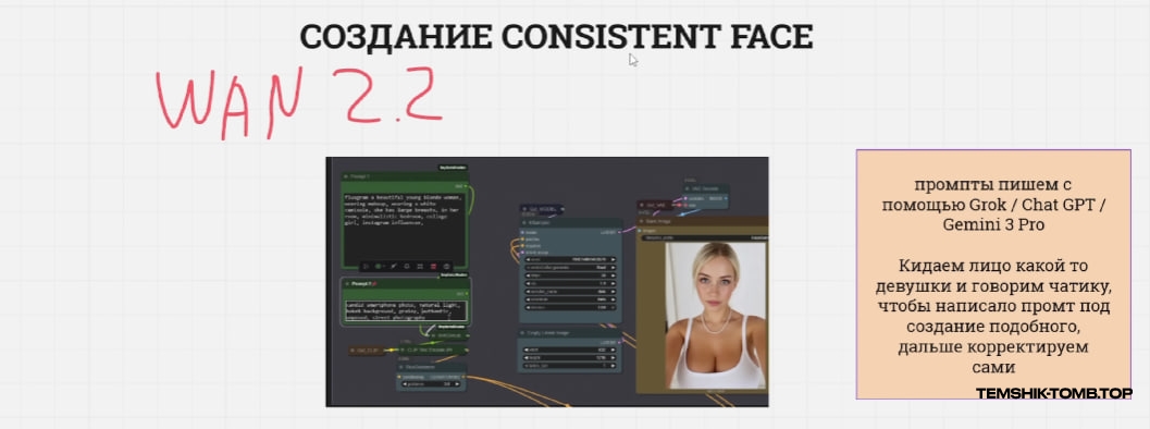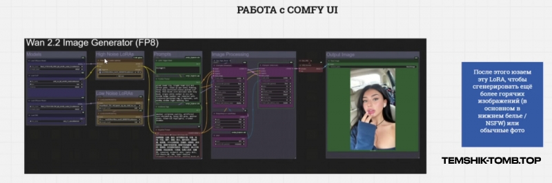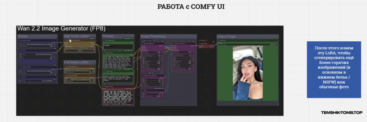 После того как Lora готова, начинаем работу с Comfy. Если у вас мощная видеокарта и много гигабайт, можете установить локально на ПК. Если ПК слабый — можно арендовать VDS, по деньгам это тоже недорого. Лучшие реалистичные фотки сейчас показывает модель Wan 2.2, для неё есть готовые workflow в открытом доступе.