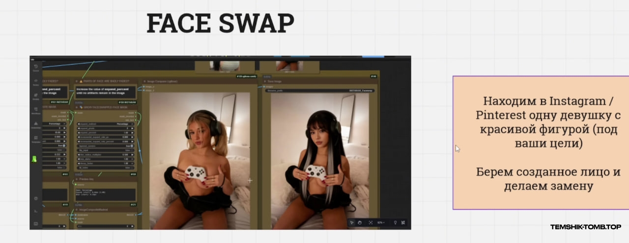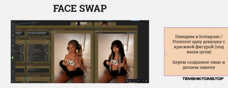 После того как лицо у нас готово, нам необходимо его фейссвапнуть. FaceSwap - это замена лица.