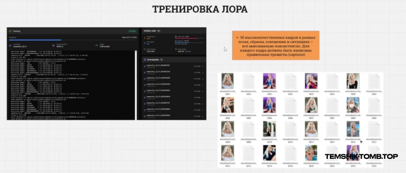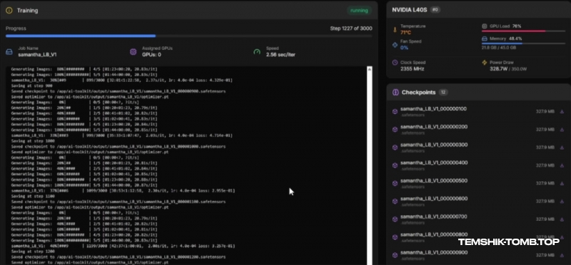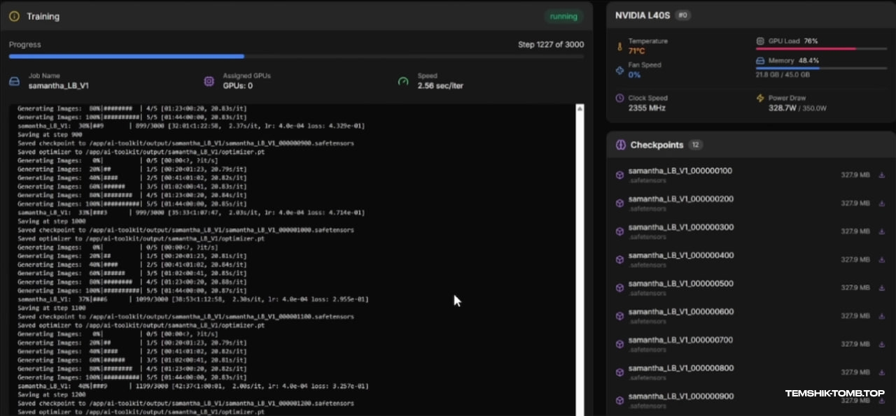 Так выглядит процесс тренировки Lora — он занимает 2–3 часа и по деньгам в среднем выходит около 3 долларов. Вы просто загружаете датасет и ждёте. Lora создаётся в 3000 шагов, разница между каждой фоткой - 100, то есть 100, 200, 300 и так далее до 3000. Потом вы скачиваете каждую, отдельно загружаете в workflow и пробуете с ней генерировать. Та Lora, которая даёт лучший результат, остаётся в работе, остальные можно удалить.