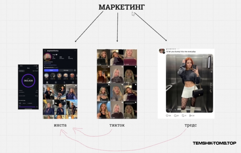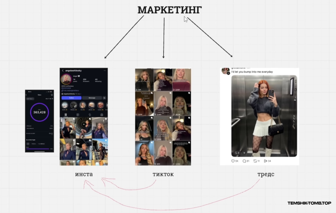 Почему с TikTok и Threads ссылки ведут в Инсту? Потому что именно в Инсте лучше всего размещать основную ссылку на платную страницу, не будет проблем, это ключевая площадка из трёх. Инсту нужно качать, фармить и набивать аудиторию. Также есть вариант закупать рекламу в инстаграм и телеграм. Как понять, какой контент и подписи делать? Просто берите конкурентов и делайте копипаст, но желательно только интересных и уникальных идей, которые уже залетели - на старте это нормально, потом втянетесь.