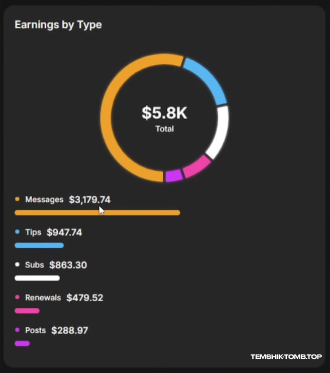 Messages — это личные сообщения, где мы общаемся и продаём контент. Tips — чаевые. Subs — платные подписчики. Renewals — те, кто возвращается. Posts — покупка постов на странице.