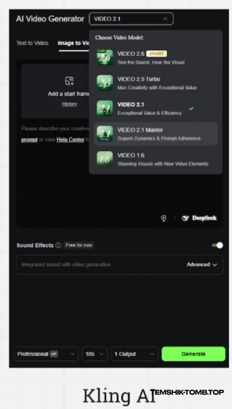С фотографиями разобрались, дальше — генерация видео. Самый топовый генератор — Kling, там очень классные и реалистичные движения. Используйте модели 2.1 или 2.5 Turbo.