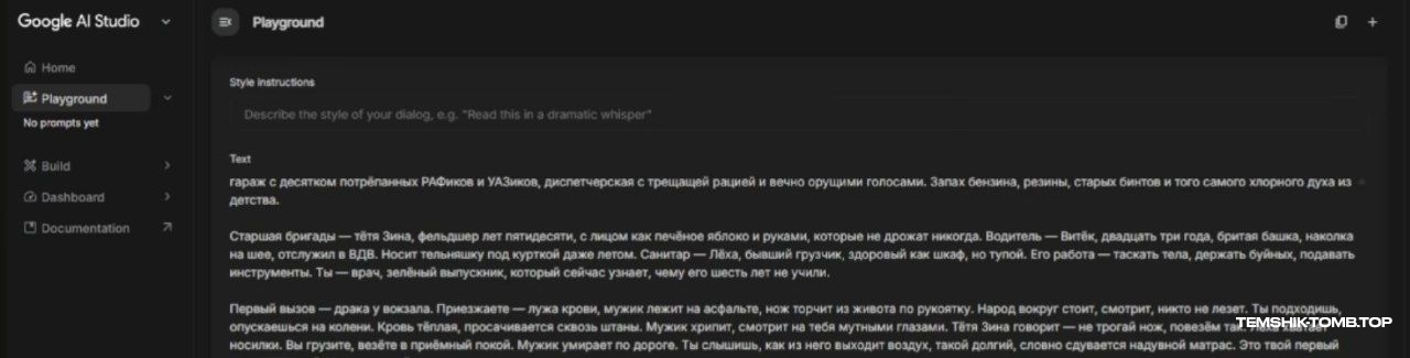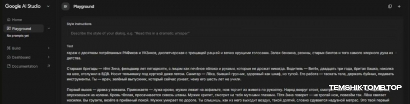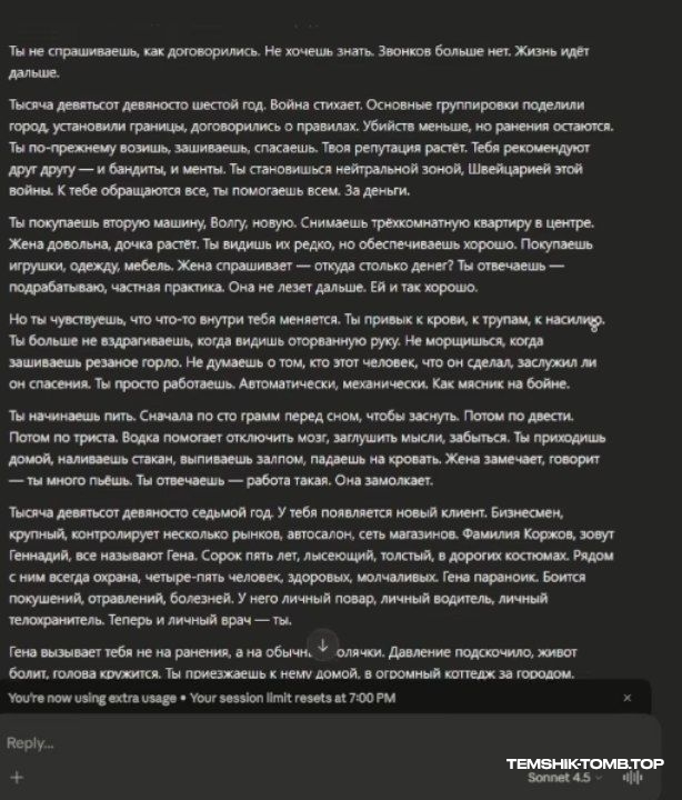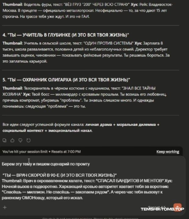 Возьму идею «Ты врач скорой в девяностые». Даём ему эту тему и пишем сценарий по промпту. Огромный промт закрепил в канале. Мне не жалко, пользуйтесь на здоровье.