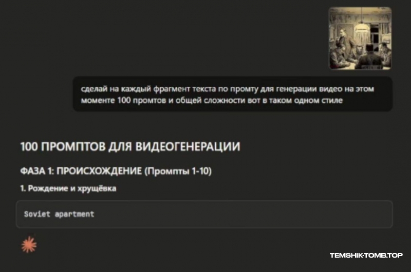 Давайте возьмём вариант стиля у конкурента, на выбор. Идём к Клод и даём задачу "сделай на каждый фрагмент текста по промпту для генерации видео." В данном случае где-то на 20 минут видео получается. А если брать 10 секунд на одну вставку, то 6 в каждой минуте. 6 умножаем на 20, получаем 120 промптов.